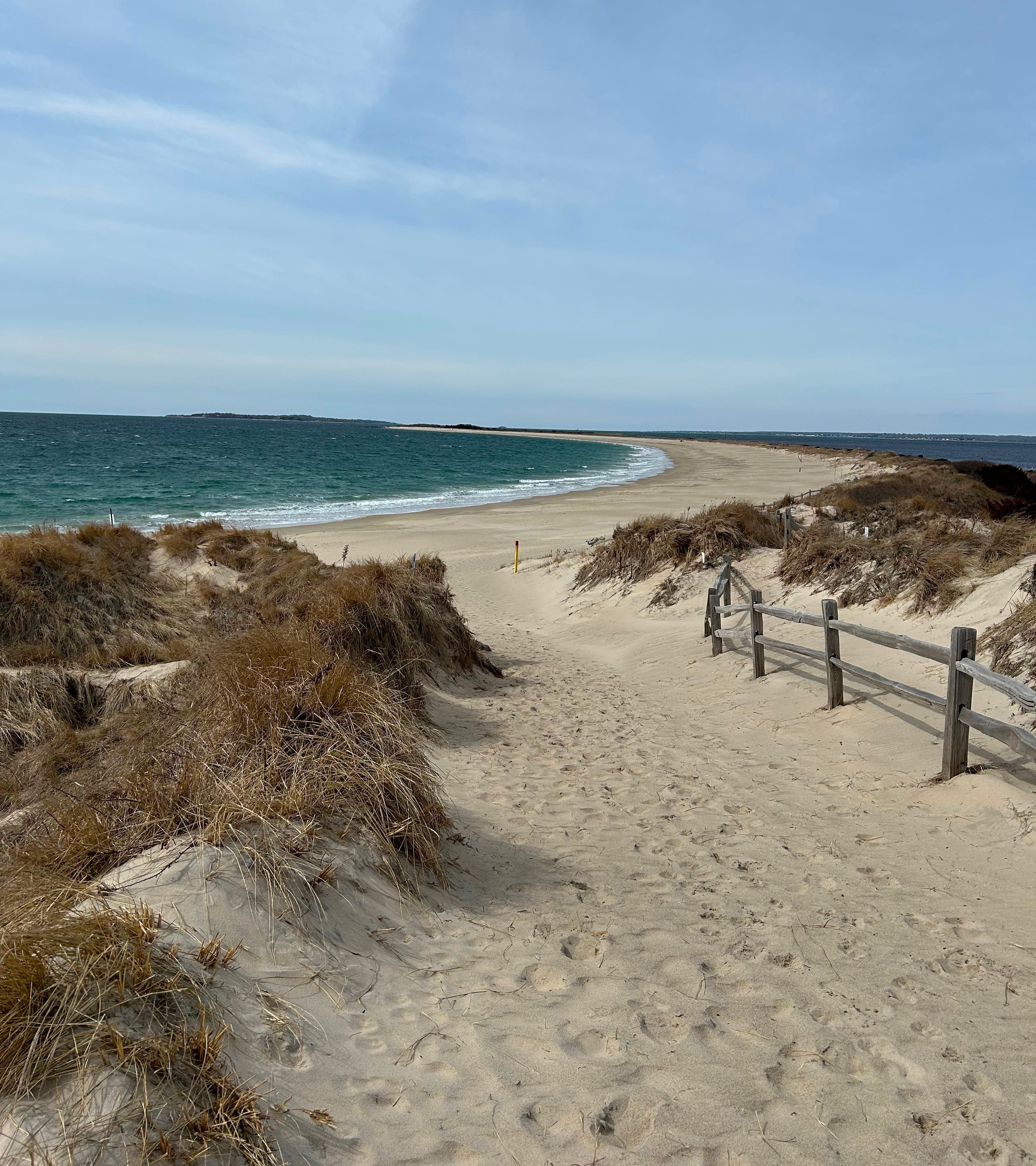 Napatree is a sandy peninsula that juts out of Watch Hill’s commercial district, separating the mouth of the Pawcatuck River from the Atlantic Ocean. A little more than a mile of pristine beach forms a pleasant crescent, immediately visible from the top of the dunes adjacent to the parking lot. In the summertime, people carry mesh chairs, striped towels, and small coolers, planning to spend the day at this earthly version of paradise. Off season, the beach is home to walkers bundled up against the cold and wind, some with dogs, others with friends. I often go on my own.